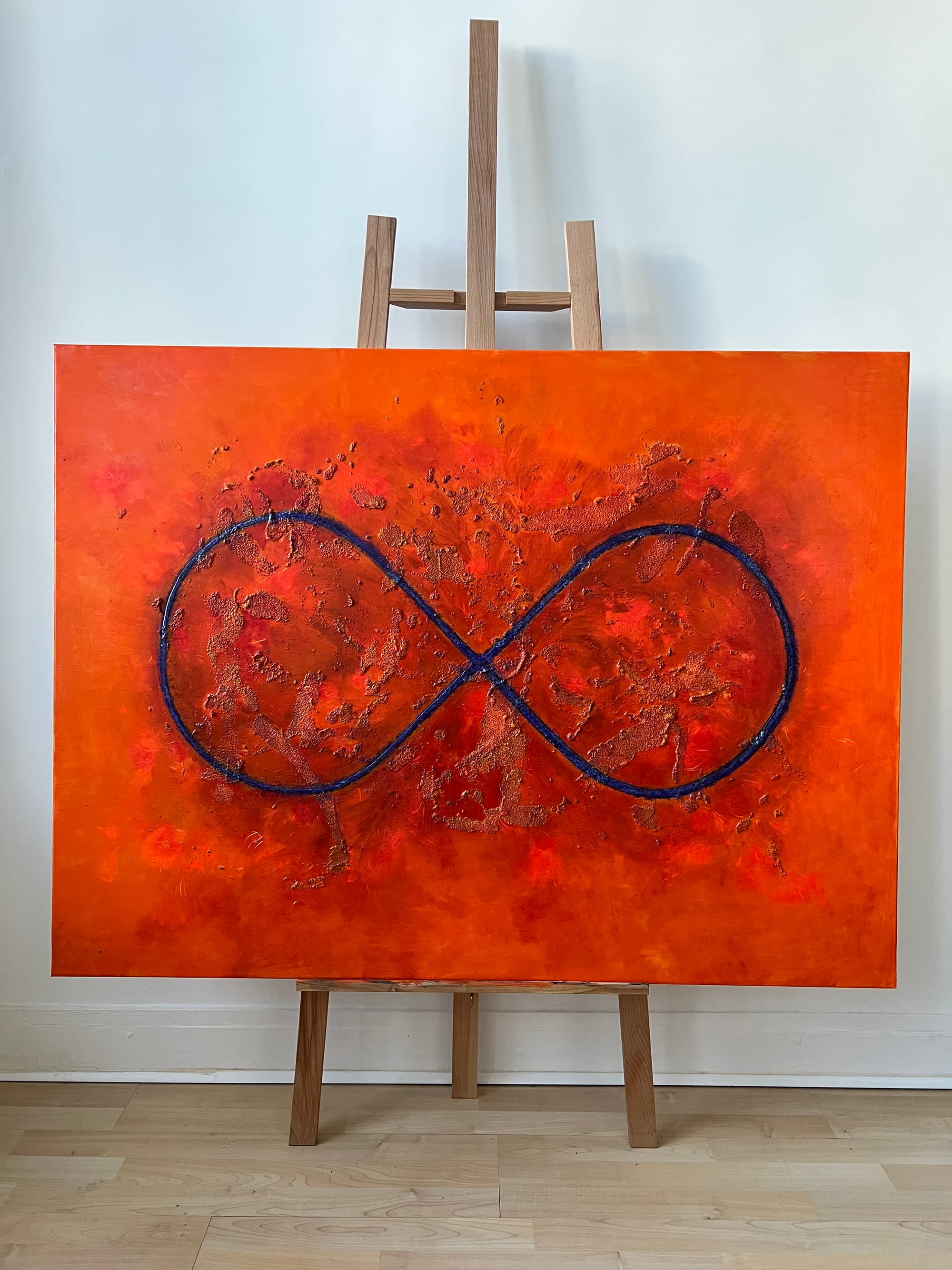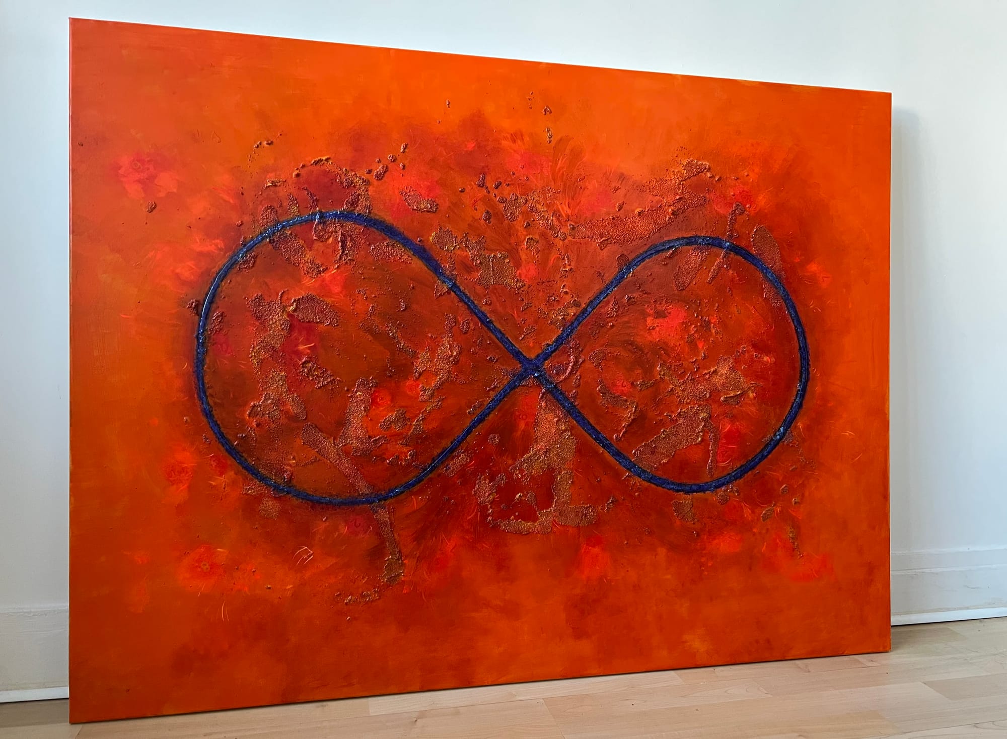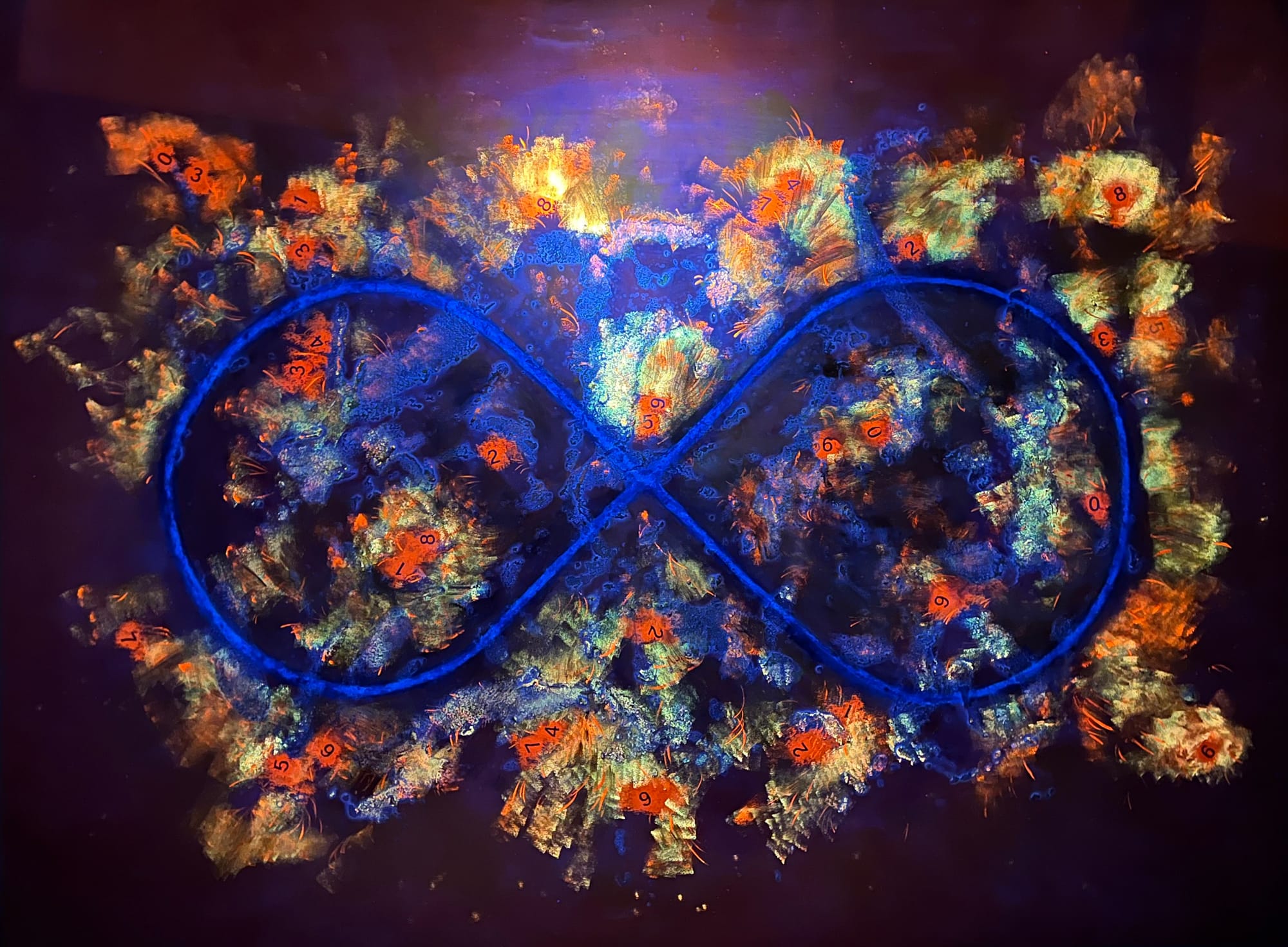 La ligne, tracée en violet bleuté profond, dessine un huit vertical continu. Sa stabilité contraste avec l’énergie mouvante du fond.