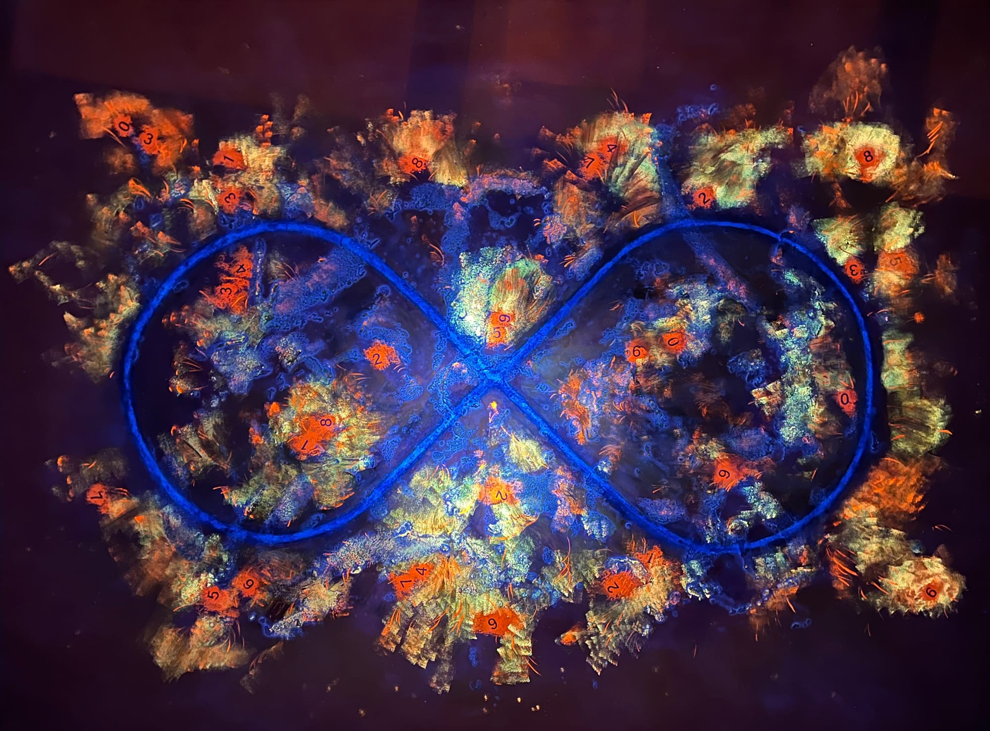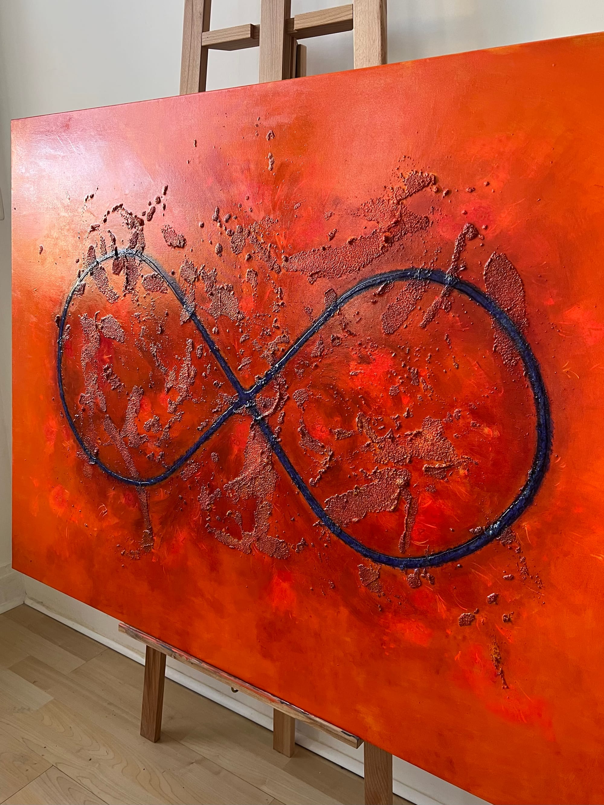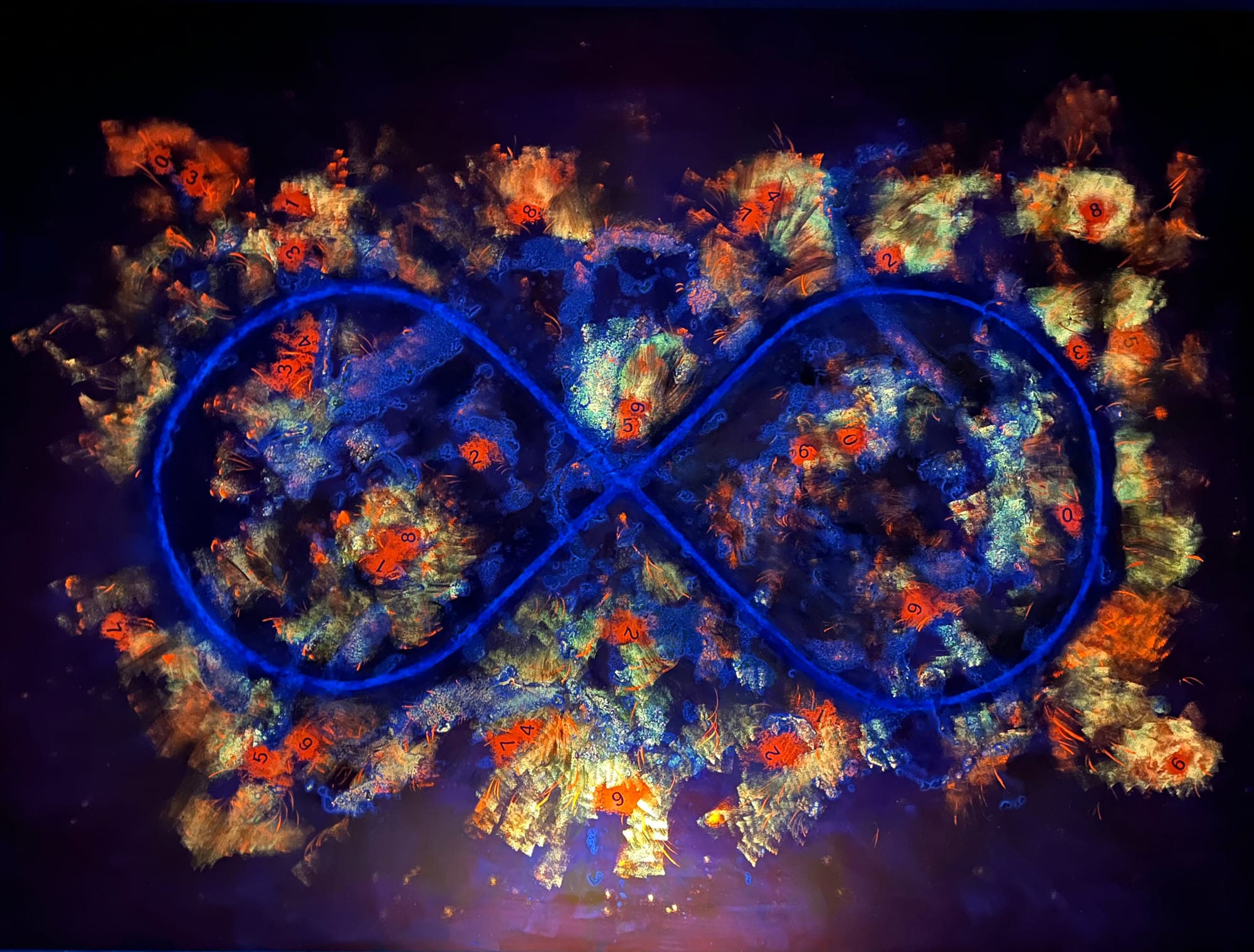 La ligne, tracée en violet bleuté profond, dessine un huit vertical continu. Sa stabilité contraste avec l’énergie mouvante du fond.