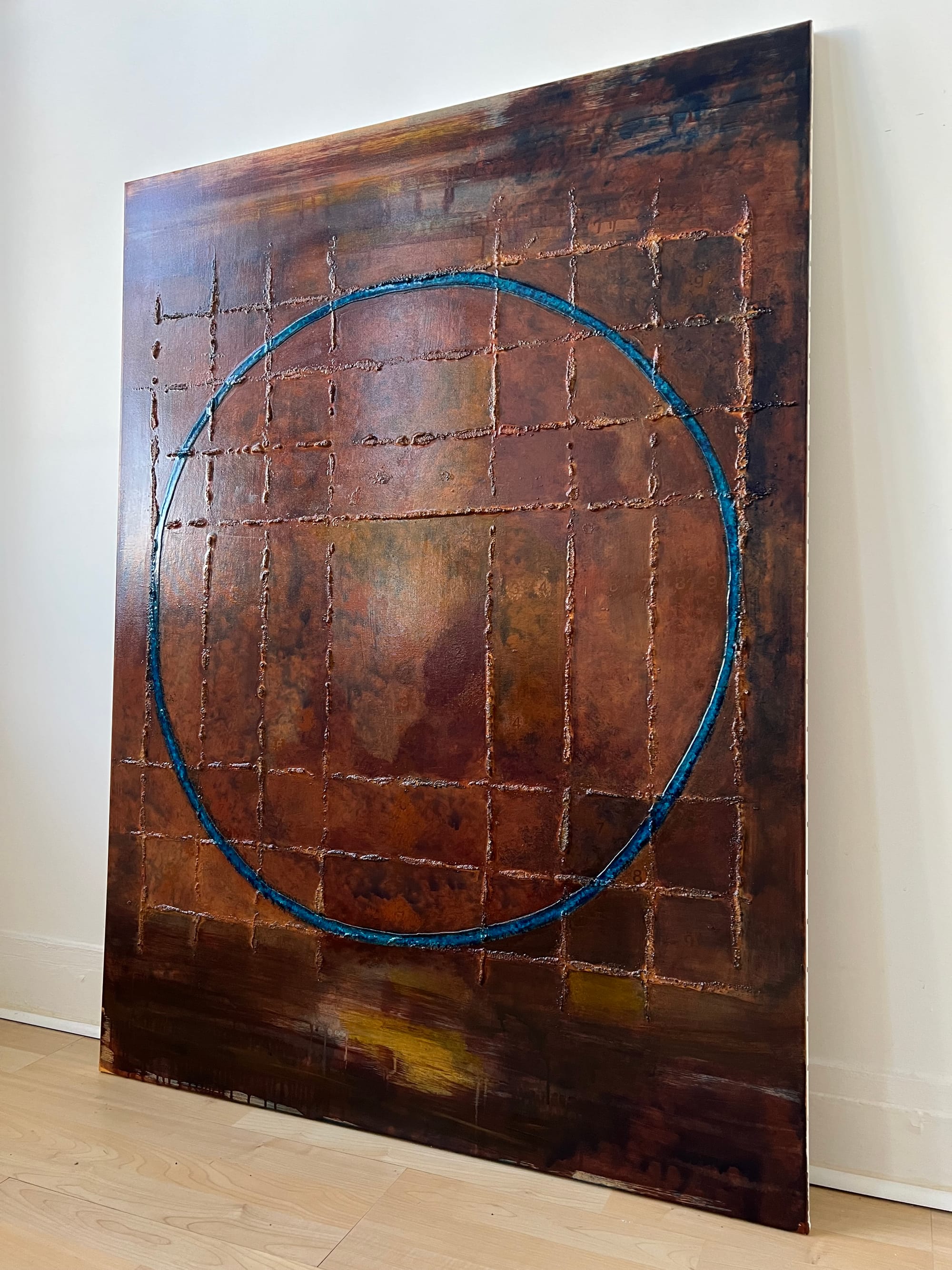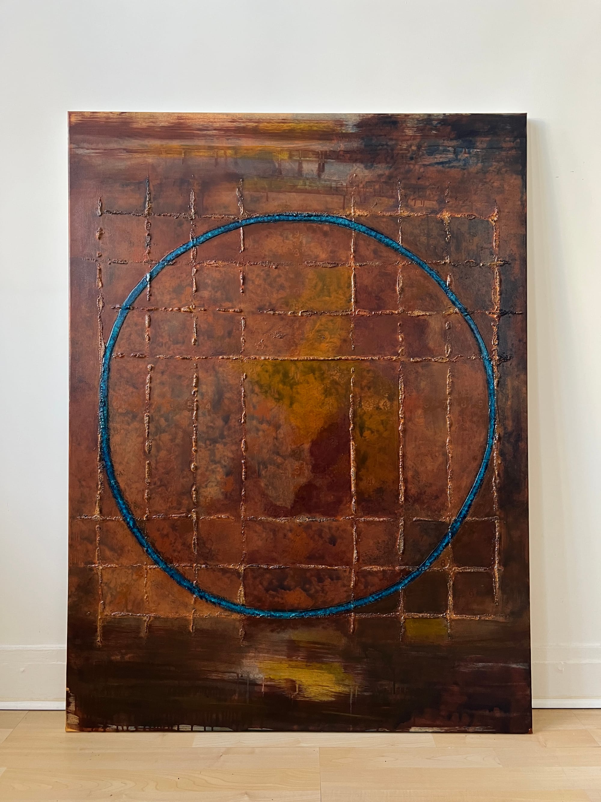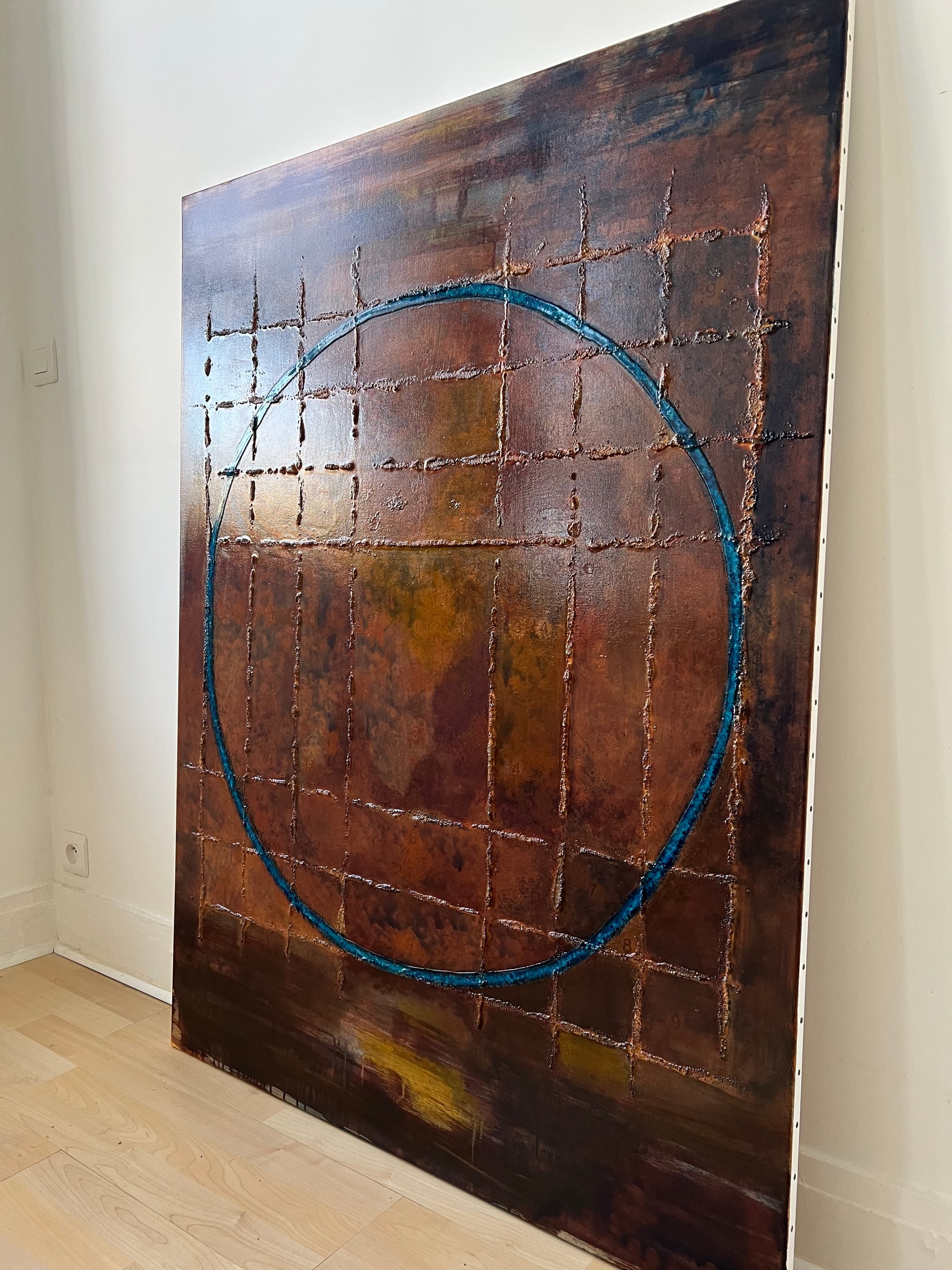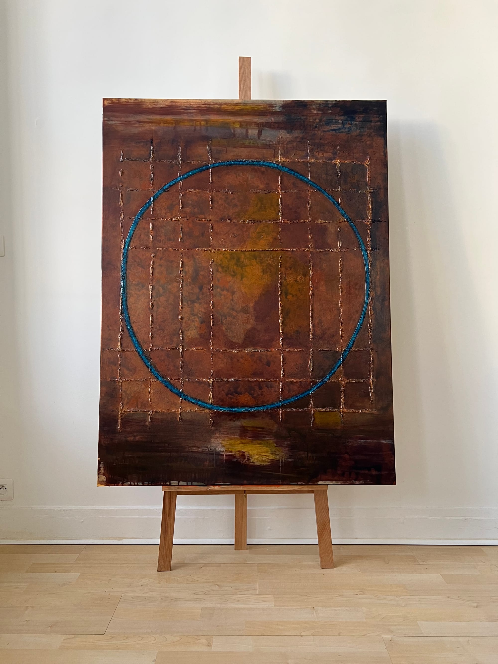 Un cercle bleu traverse cette structure. Légèrement incliné, il agit comme un point de focalisation visuelle. Il ne ferme pas l’espace mais introduit une perspective à l’intérieur de cette grille, comme une zone de lecture à partir de laquelle l’ensemble peut être observé.