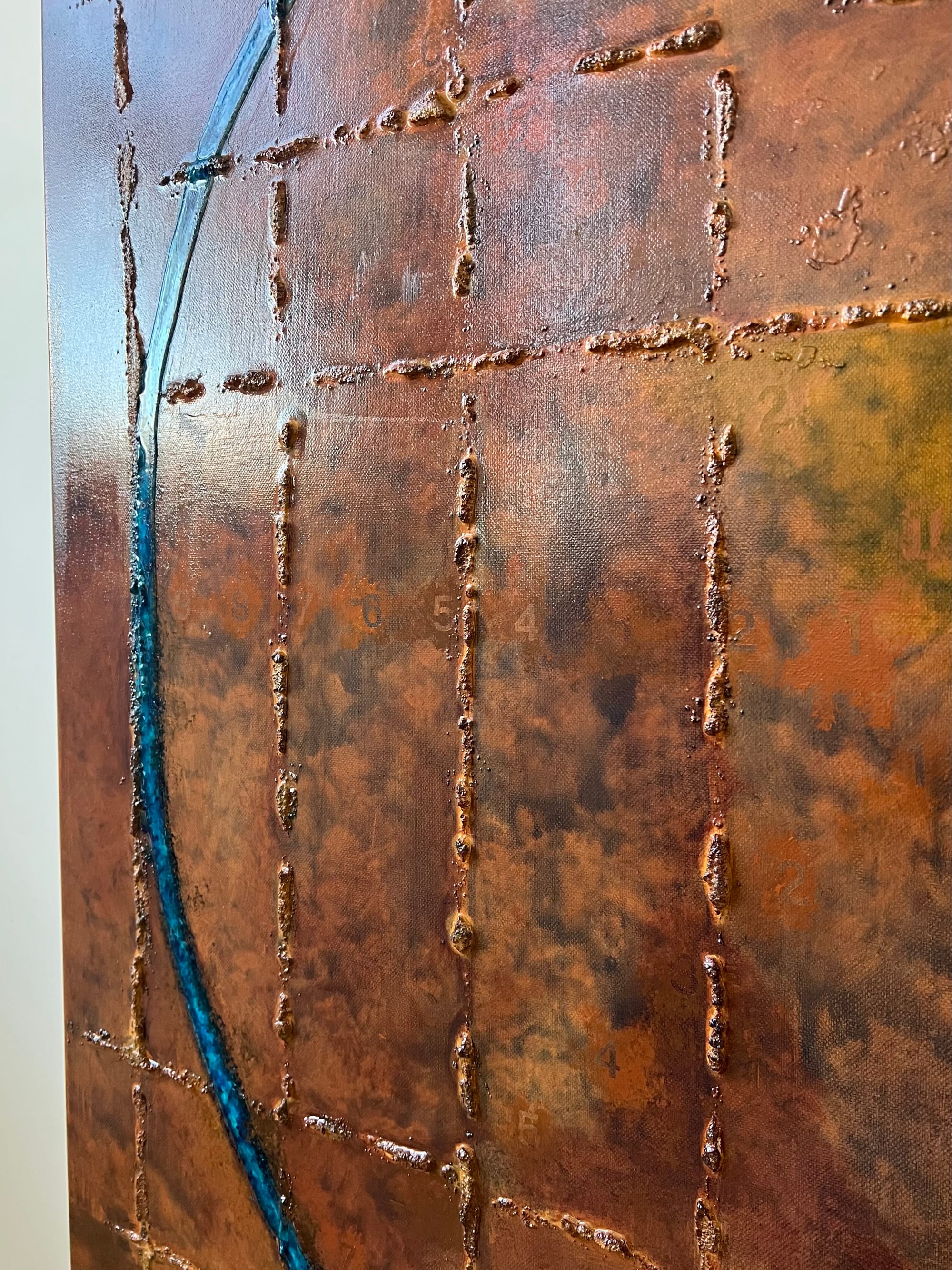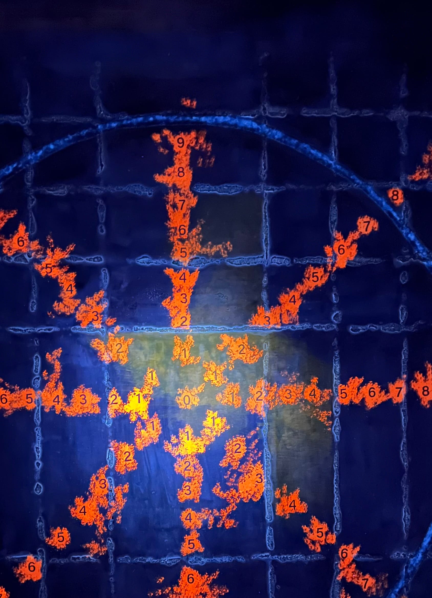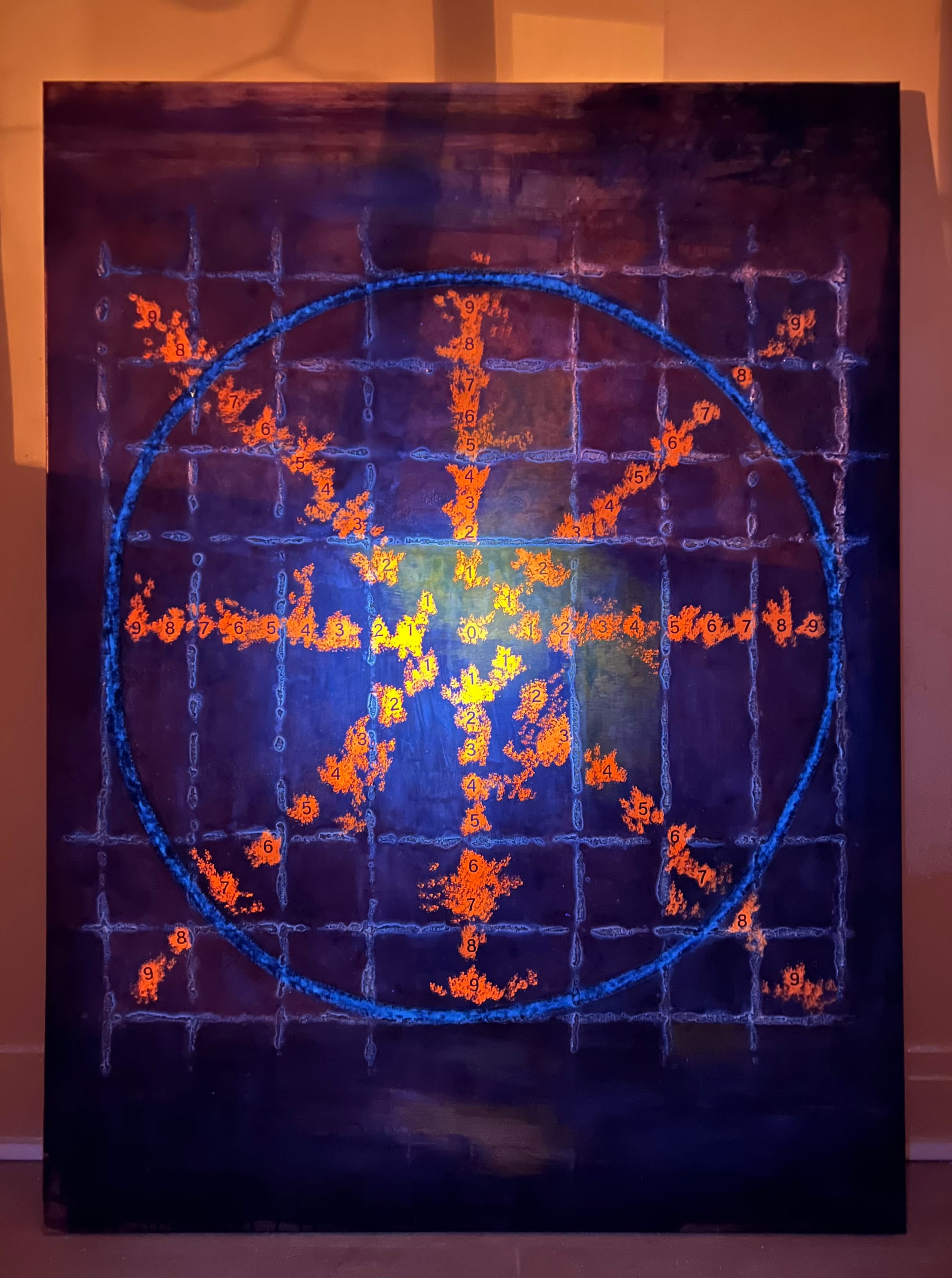 Des chiffres apparaissent dans la matière, disposés selon une organisation concentrique. Leur disposition suggère une progression et une orientation.